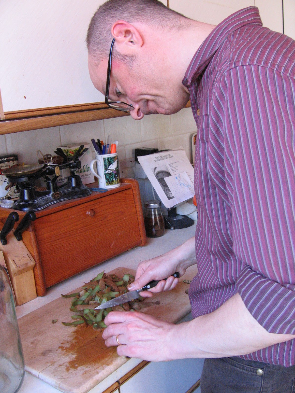 I chopped each fruit into eight and put them all in the bucket. They got a good mash and I added three pounds of sugar. I boiled seven pints of water and poured this over. The process made me irritable - which I worked out was because I got too hot and Stan, who does not like any food I currently serve (except creme caramel), whined incessantly. I locked him in the front room with some Sainsbury's Own Brand.